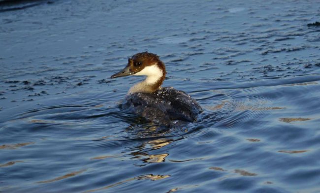 Again we were greeted by a stunning sunrise and -10 or more temperatures. Soon after setting off I slowed to look at a few geese and duck on an area of 30 feet square open water next to the bridge. A few Smew and White-fronted Geese were among the gathering and I noticed a Reed Bunting feeding on phragmites seed heads. Another bird caught my eye, rufous and blue…it was a male Bearded Tit, one of those birds you always enjoy watching and this one fed in the open and for the whole time we were with it. This was in sunny, calm conditions. Across the bridge a female Smew and male Goosander fished close by.