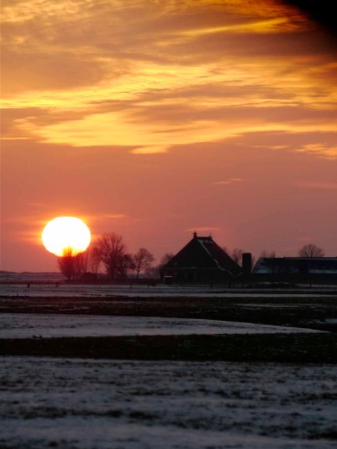 We had breakfast at 0715, I have to say it was excellent and we were in the car by 0800. Sunrise on a nearby dike just south of Makkum allowed us to watch tens of thousands of Barnacle and White-fronted Geese leaving the Ijsselmeer roost (on the ice?) and head to the fields for the day. Wonderful watching plus Hen Harrier and a female Goosander searching for open water. It was cold, the night saw -10 temperatures and geese foraged anywhere grass was not snow covered. Some birds were very tame, others skittish.