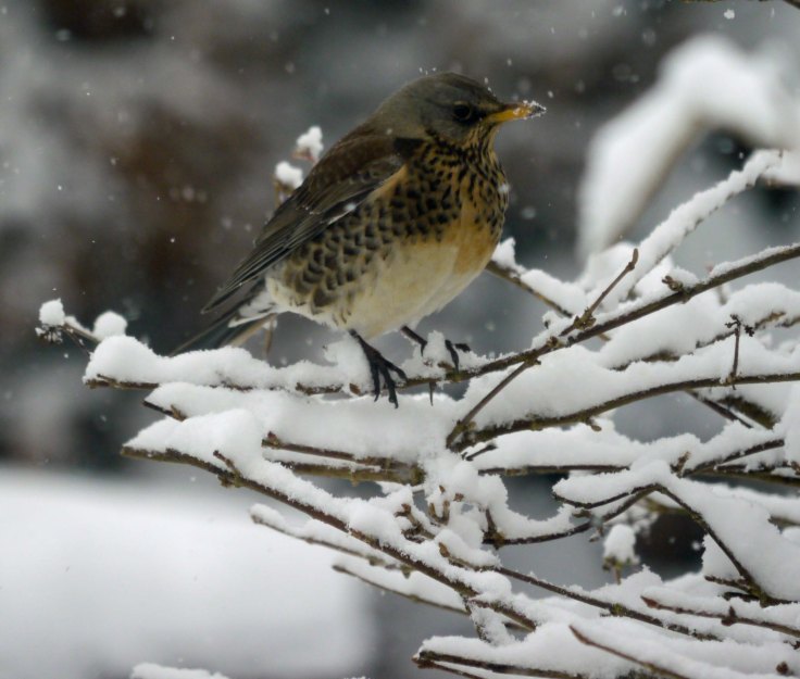 18 January 2013 The snow that fell drew lots of birds to my garden apples. I had 62 Fieldfare on the deck and low shrubs at one point!