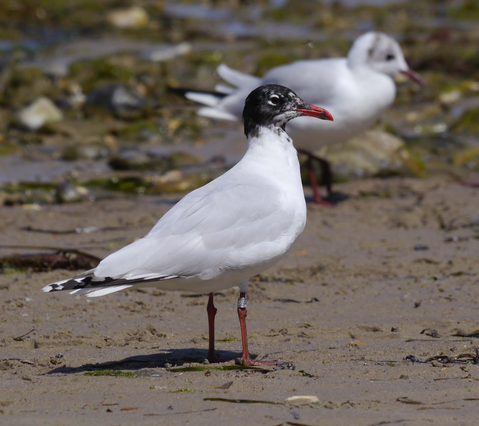 MEDITERRANEAN GULL second summer with Black-headed Gull on Studland South Beach, Dorset. Dozens of them could be found in this area. This bird is ringed.