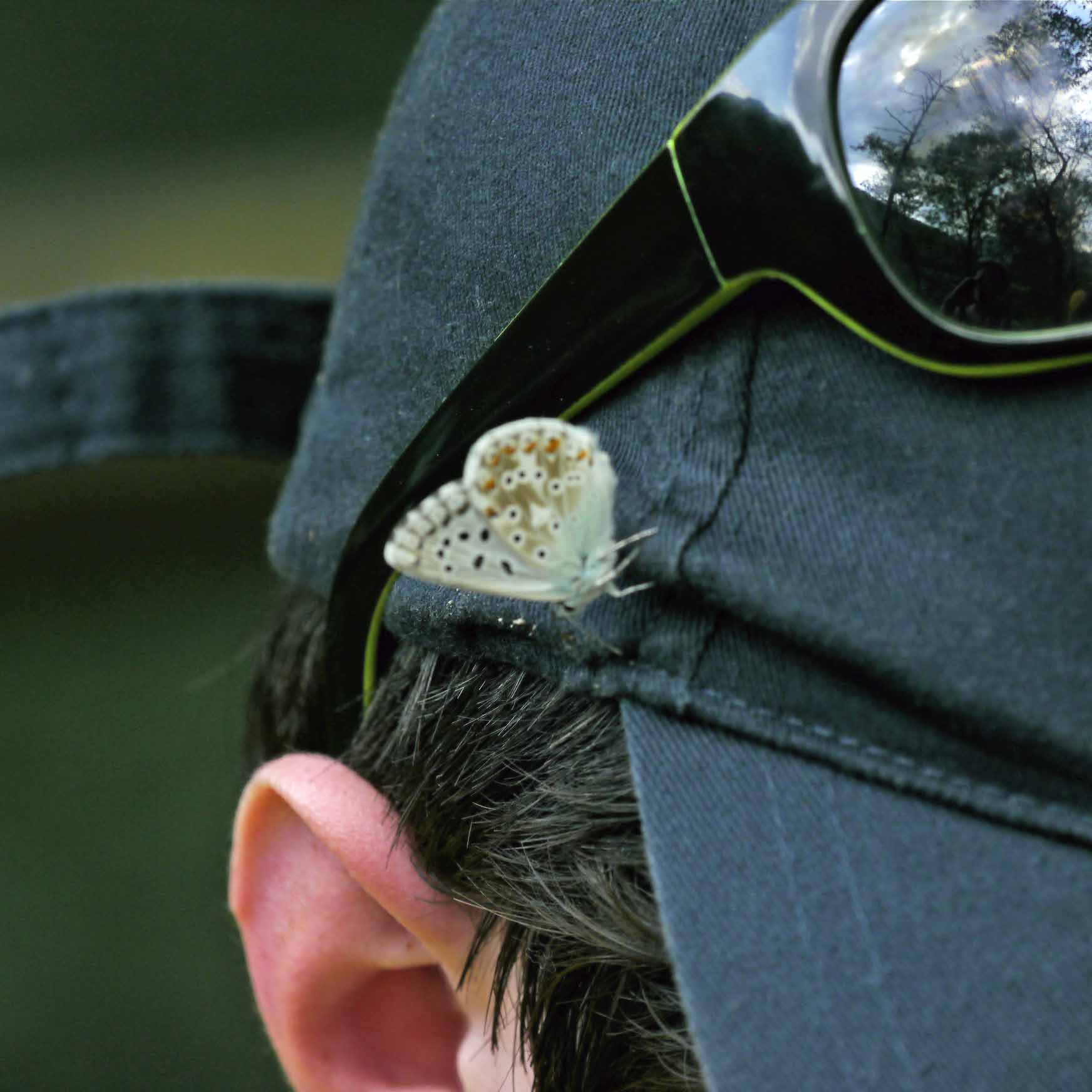 Soca Valley Lizard and blue butterfly enjoying the salt (sweat)