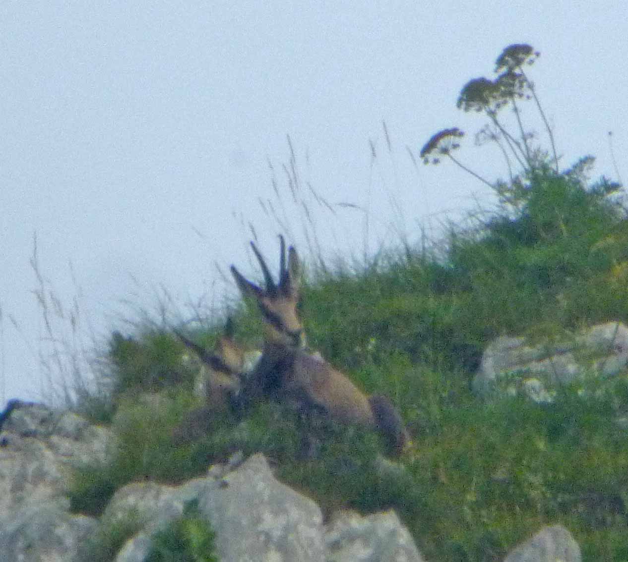 I drove up from the road and parked off the track then setting off on foot. I tried to ignore birds on the way up until I reached above the treeline where the scrub appeared. A Pied Flycatcher and many Spotted Flycatchers caught my eye, flocks of warblers appeared with numerous Great and Blue Tits. Chiffchaff and Blackcap were common but a Wood Warbler was a nice find. Plenty of Red-backed Shrikes were around, mostly juveniles but an adult male as well. A juvenile Cuckoo showed a few times, Jays were below over the woods and c8 Kestrel and 2 Buzzard soared over the steep slopes. During my regular sweeps across the boulders and crags I spotted two Alpine Chamois, a very welcome surprise.