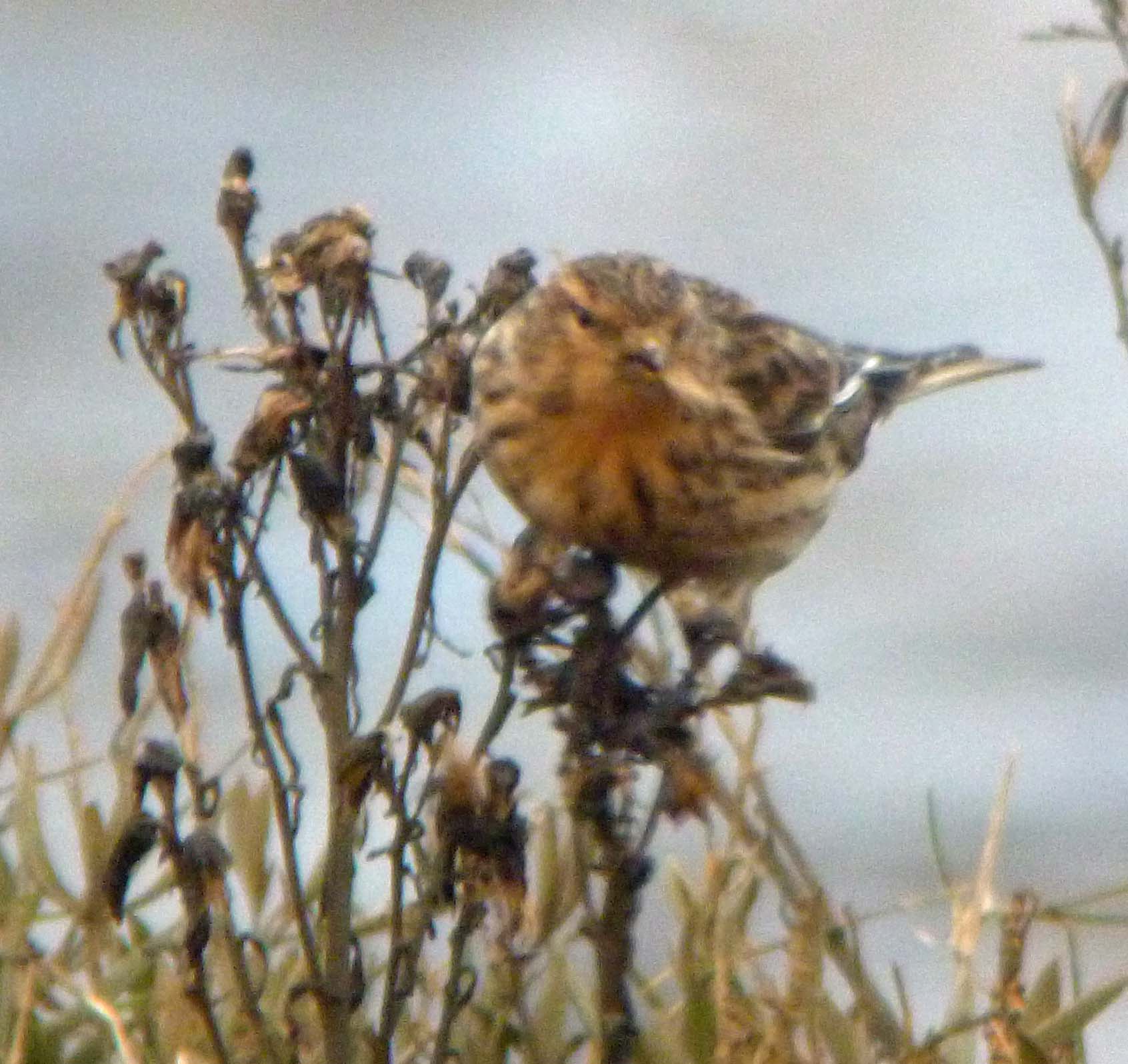 Moving the short distance to Holme dunes it did not take long to locate a flock of 30 Snow Bunting. This mini blizzard settled on the frost laden high tide strand keeping company with Skylarks. The saltmarsh was busy with Knot, Redshank and Reed Bunting and the wader roost on the point was very busy with Oystercatcher, Bar-tailed Godwit, Curlew, Dunlin, Knot, Sanderling, Grey Plover and Redshank. Out on the sea some distant Red-throated Diver and Merganser were noted.